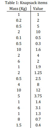 Problem: You are asked to apply Simulated Annealing and Genetic Algorithms to a variant of the Knapsack problem. In this knapsack problem, you have 20 items in total with each having a separate value and mass. Your objective is to minimize mass while maximizing value. There are 20 items in total you can choose from, but the knapsack can only hold 10 items and can hold a maximum of 25Kg. The value and mass of the items are given in the following table.